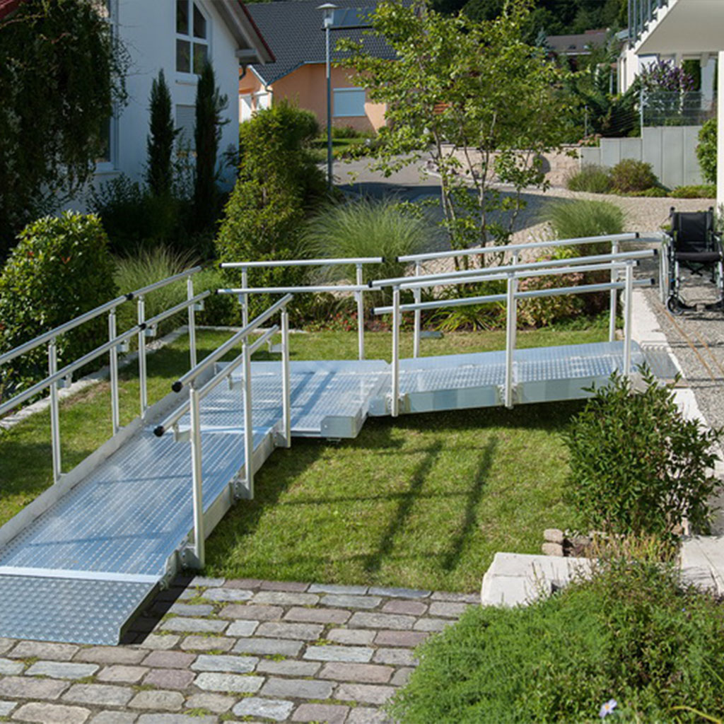 Das LBW Modulrampensystem setzt dort an, wo bis jetzt Stufen ausgereicht haben, um in Ihr Haus zu gelangen. Standardmäßig ist es in den Innenbreiten von 800, 1000 und 1200 mm erhältlich. Die verschiedenen Elemente (Eckpodest, Wendepodest, Ruhepodest, gerader Steg) tragen je 400 kg, passen modular zusammen, und bieten eine fast unendliche Vielzahl an unterschiedlichen Rampensystem-Lösungen.